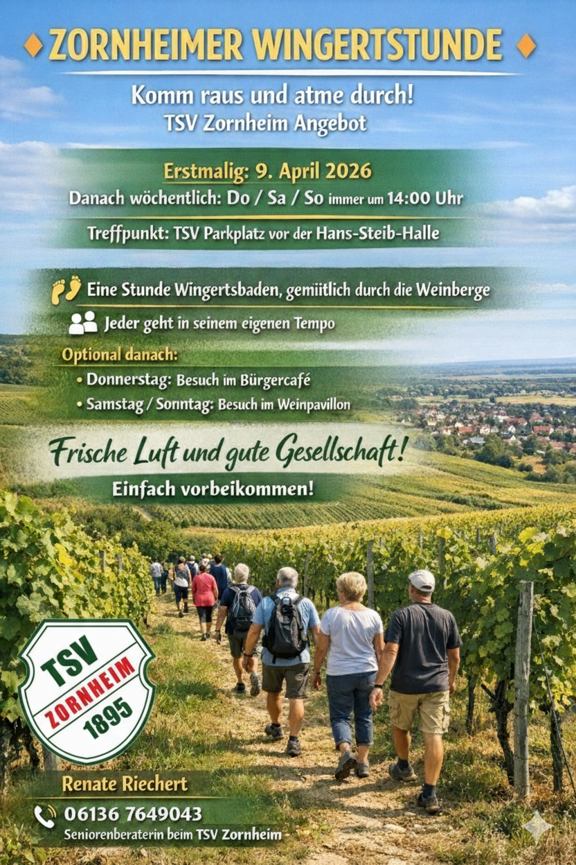 Ab dem 9. April 2026 startet beim TSV Zornheim die Zornheimer Wingertstunde. Ein offenes Spazierangebot für alle, die gerne draußen unterwegs sind und Gesellschaft schätzen.